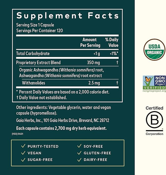 Gaia Herbs, Ashwagandha Root Vegan Liquid Phyto Capsules - Stress Relief, Immune Support Supplement, Balanced Energy Levels and Mood , 120 Ct (Pack of 1)