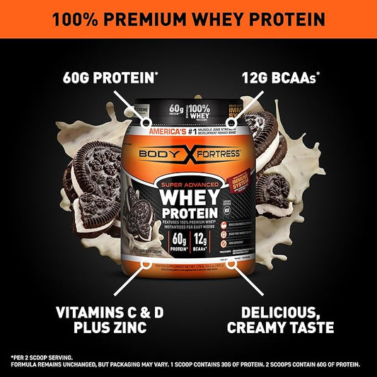 Body Fortress Super Advanced Whey Protein Powder, Cookies N’ Creme, 60g Protein & 12g BCAAs Per 2 Scoops, Muscle Gain & Recovery, Immune Support with Vitamins C & D, 1.78lbs (Packaging May Vary)