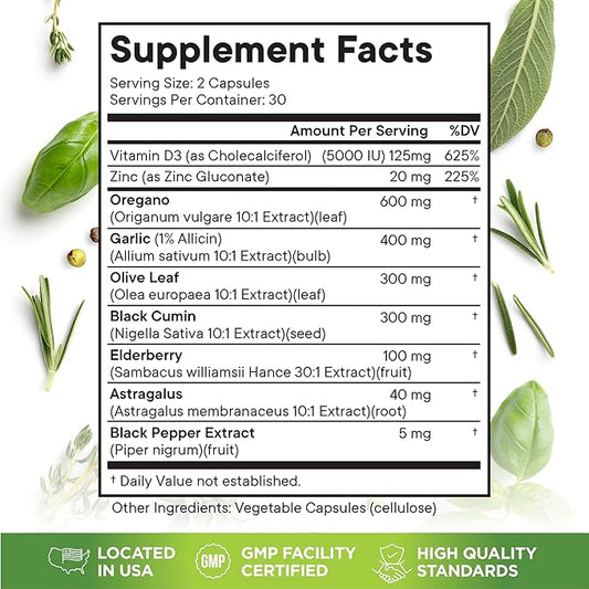 Oregano Oil 6000mg Garlic Extract 4000mg Olive Leaf 3000mg Black Seed Oil 3000mg Astragalus-Immune Support & Digestive Health Supplement for Women and Men- 120 Count